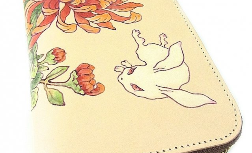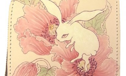 今回は、ヌメ革に赤のインクの濃淡で描く事で時間を経て仕上がっていく花の魅力を描いてみました。より映えてくる兎の白とより透明になっていく花の雰囲気を楽しんでください。