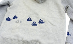 胸ポケットの和柄は、”そろばん柄”。根強い人気のパンダ兎とあわせて。さりげなく袖口には、小さなワッペン刺繍の兎もポイントです。