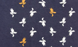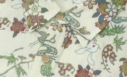 胸ポケットの和柄は、”そろばん柄”。根強い人気のパンダ兎とあわせて。さりげなく袖口には、小さなワッペン刺繍の兎もポイントです。