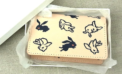 使ううちに使う人の手に馴染み、色つやも育ってくる渋染め仕上げベジタブルタンドレザーの財布に健やかな繁栄の象徴である兎をハンドプリントしてみました。